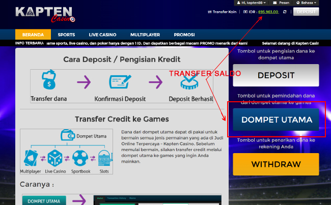 TRANSFER KOIN adalah memindahkan saldo dari Dompet Utama/Saldo Utama anda ke saldo jenis permainan yang ingin anda mainkan. Untuk dapat memainkan game yang anda inginkan, anda harus melakukan transfer koin.